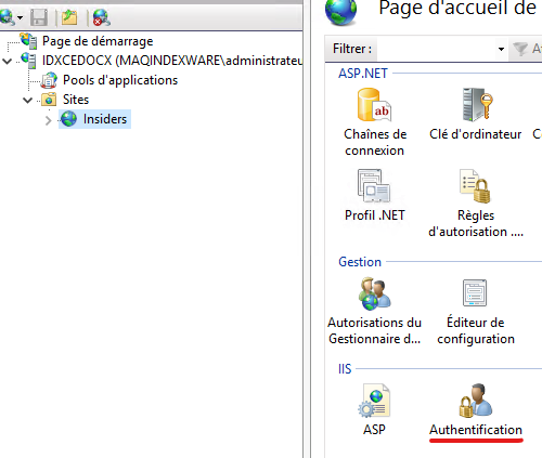| Sélectionnez le site Insiders et activé Windows Authentification | ||