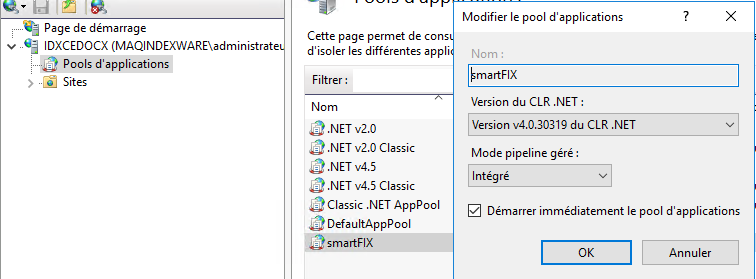 Sélectionnez le pool d'applications smartFIX et modifier les Paramètres avancés ...